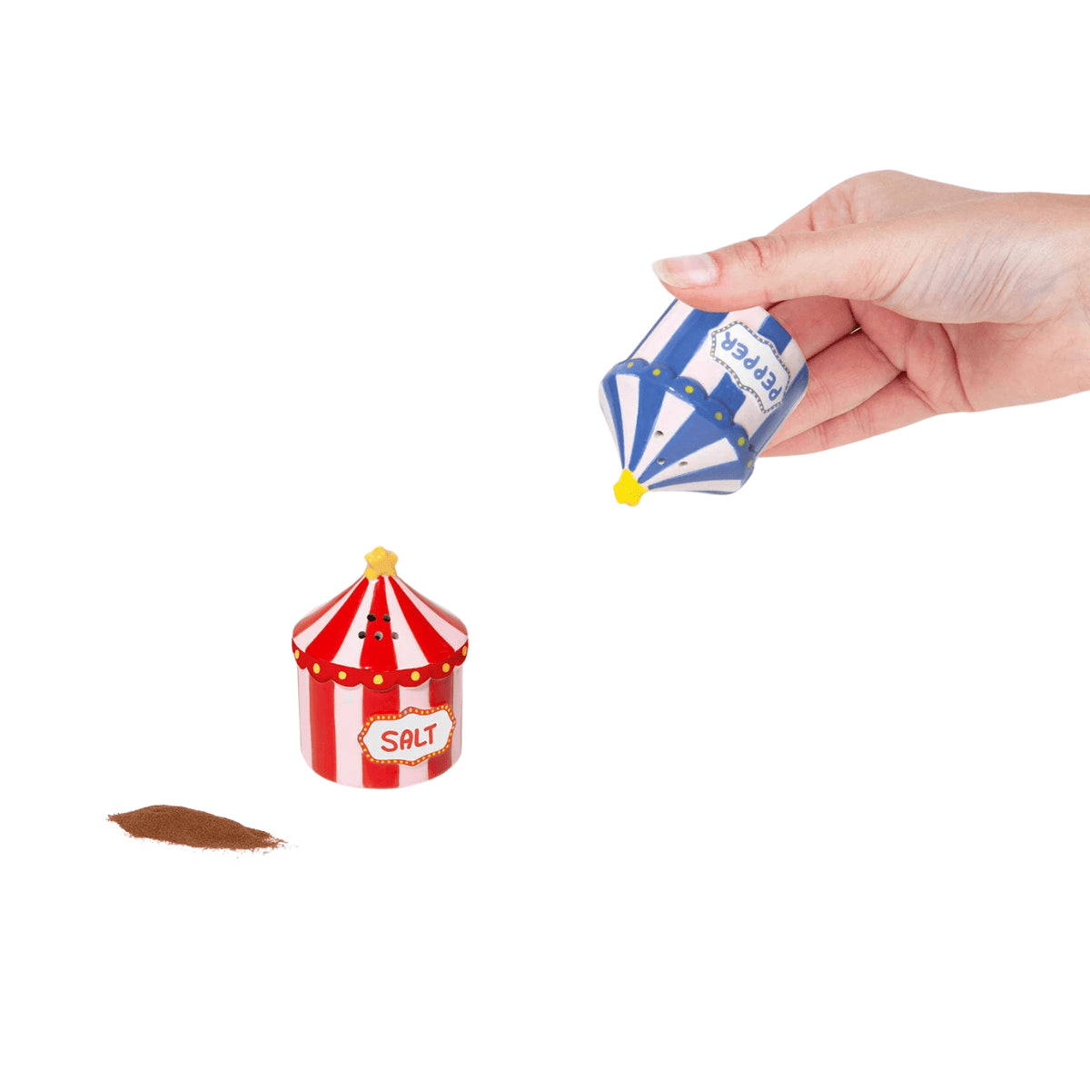 Immagine ambientata su tavolo giallo e bianco. Saliera rossa e pepiera blu a forma di giostra.