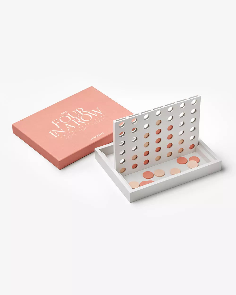 Our “Four in a Row” Set reinterprets the iconic Connect Four game in a modern way, featuring an elegant design, a refined color palette, and distinctive graphics that turn it into a true decorative piece capable of adding personality to any space.